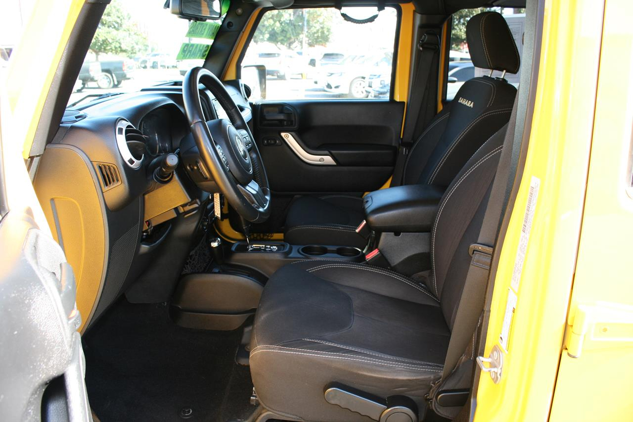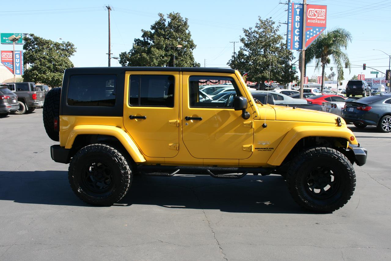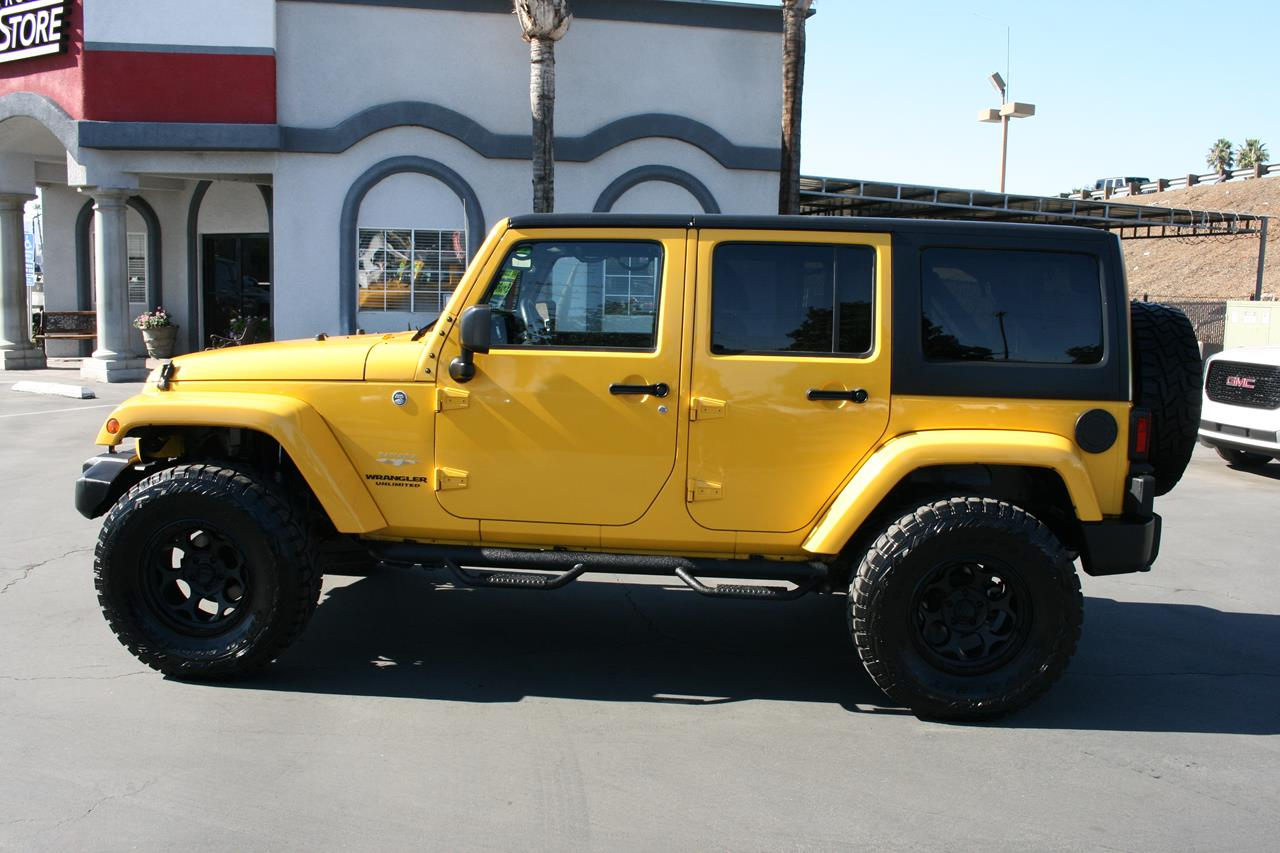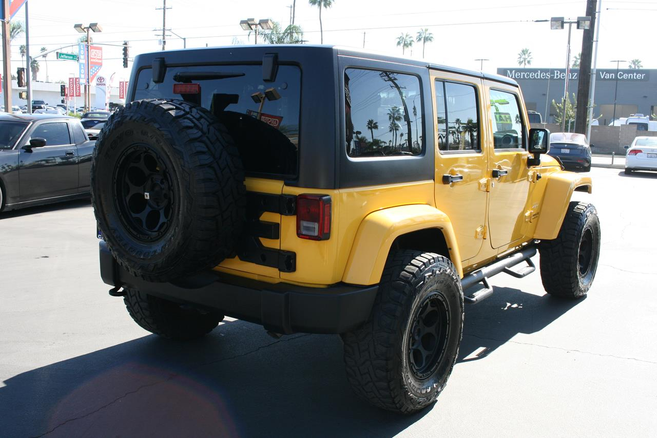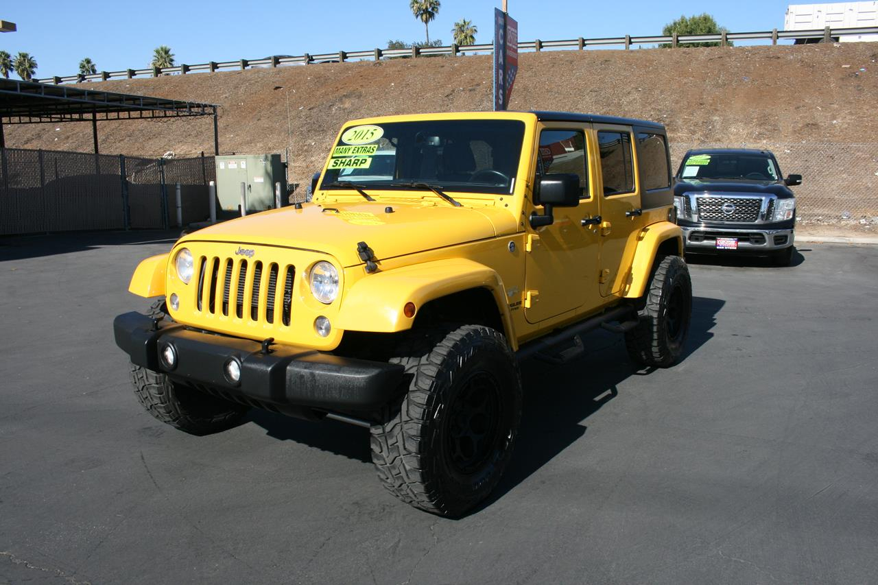 Our 2015 Jeep Wrangler Unlimited Sahara 4x4 shown in a Baja Yellow paint scheme, is ready to handle everything thrown its way. Powered by a 3.6 Liter V6 that produces 285hp and almost as much torque while combined with the rock-solid Dana axles managed by a 5 Speed Automatic transmission. This Four Wheel Drive will allow you to maintain civility or let you carve your path where ever you see fit while offering near 21mpg. With city streets and freeways providing an increasingly unfriendly atmosphere to standard, car-based suspensions, large tires and real ground clearance are increasingly handy for the committed urbanite. Take a look at one of the most widely recognized terrain busting, four-door vehicles in the world. This Jeep looks sharp with 17 inch alloy KMC rims, N-Fab rock sliders and a 3 inch Terraflex 9550 lift!